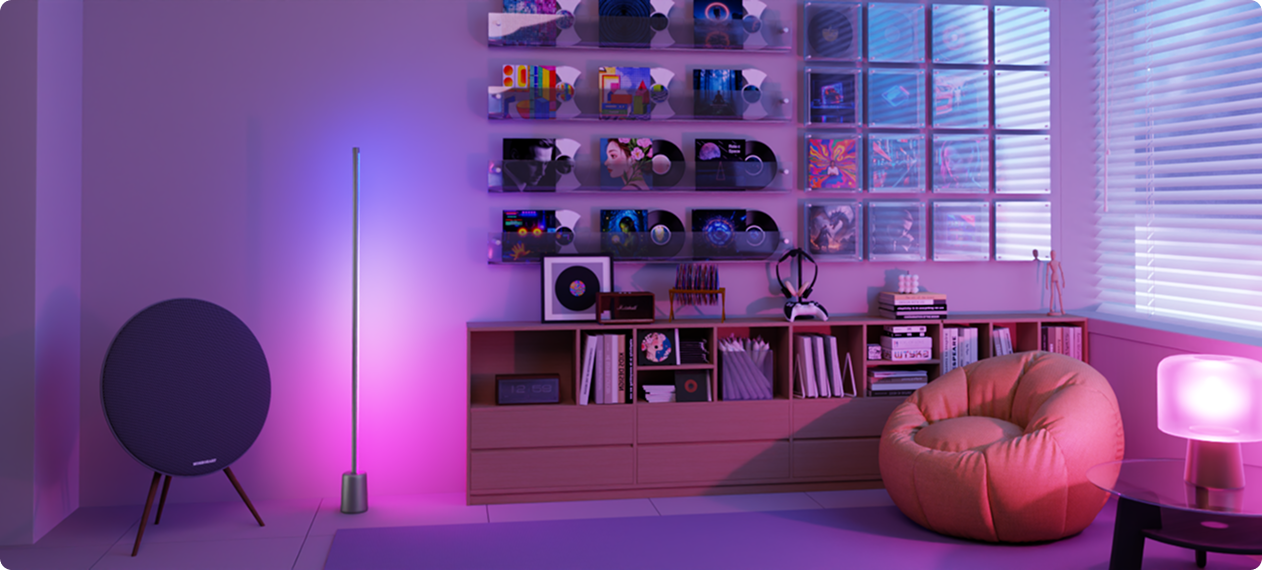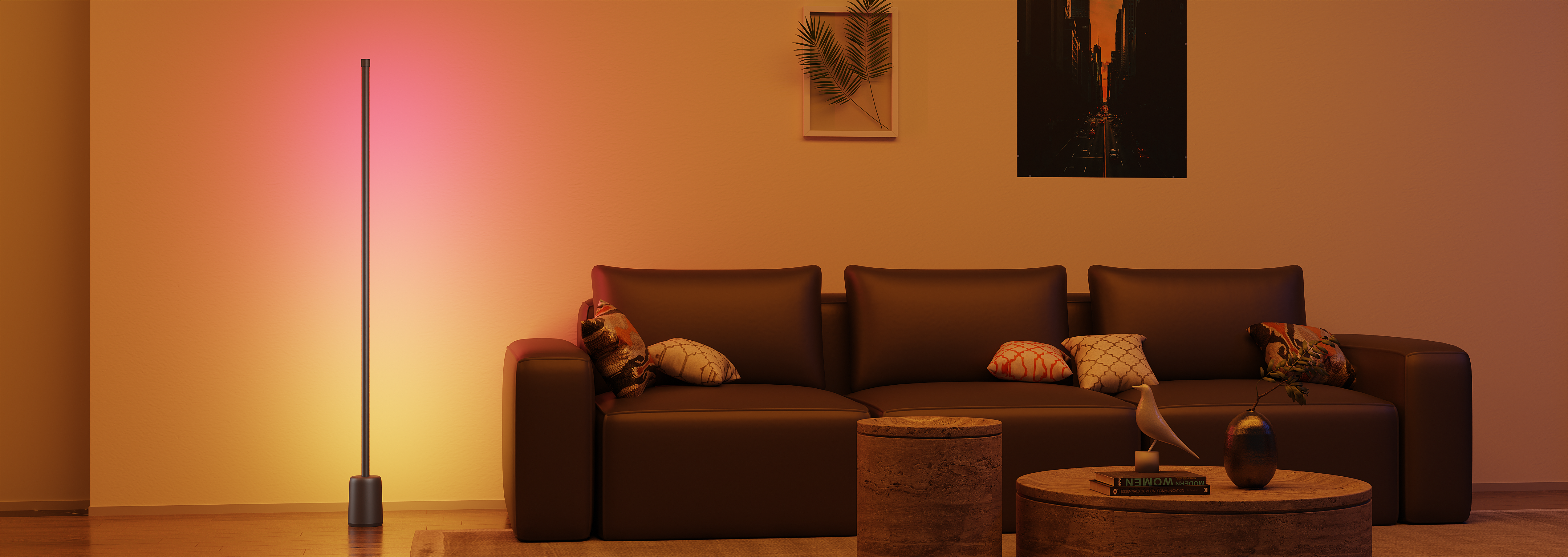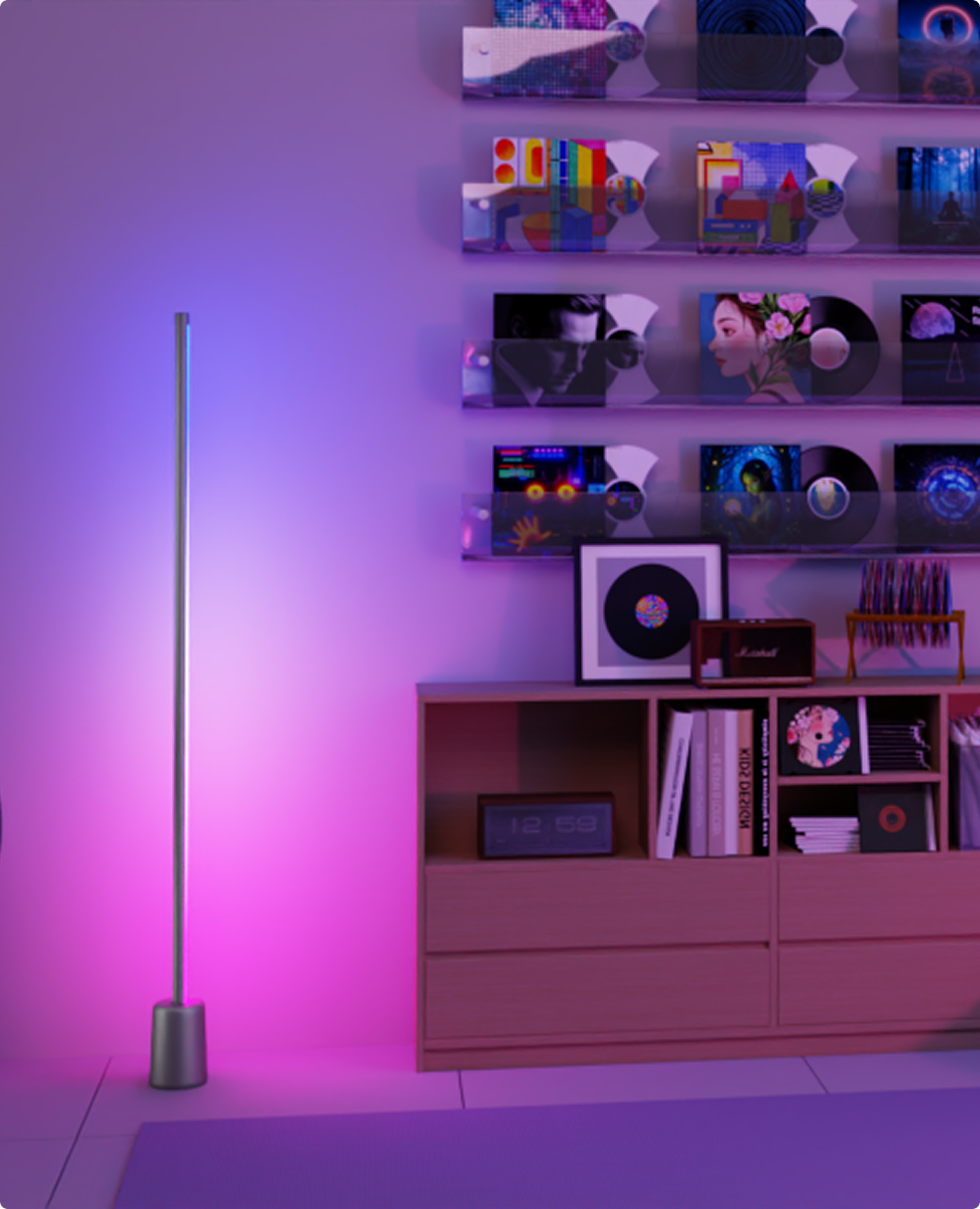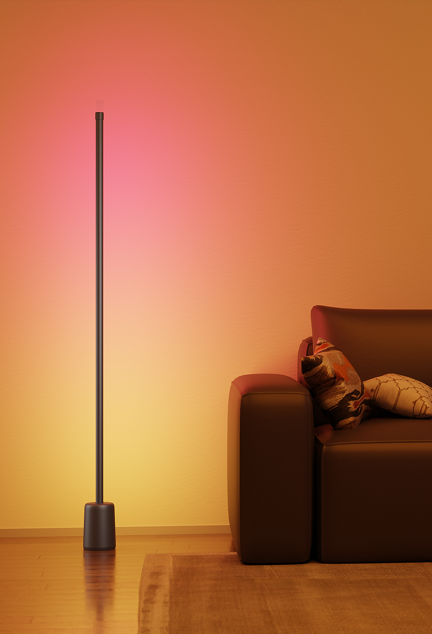 Slim design, works great without the app for warm, cool and RGB cycle light mode. Light weight and the color of the lamp itself is an eutral matte/brushed gray shade. We have this in the corner of the room facing towards the wall to reflect and give off a nice ambient light.
