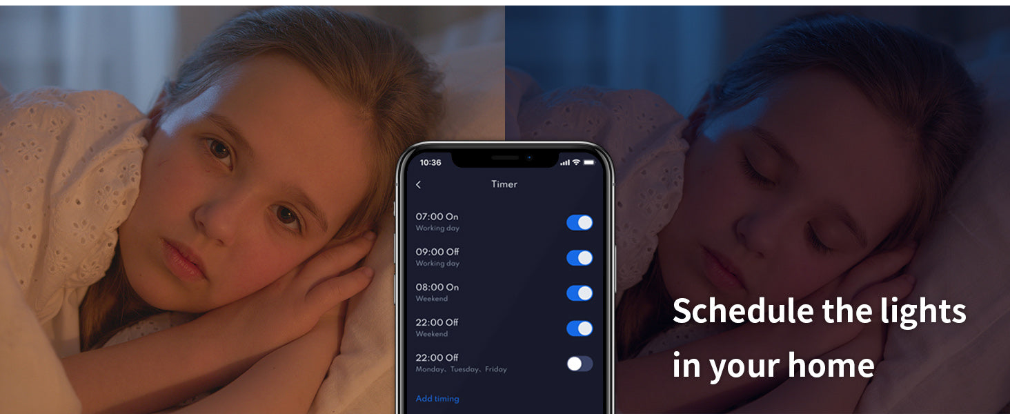 The lighting gradually illuminates or darkens with time, gently aiding you to fall asleep or wake up.